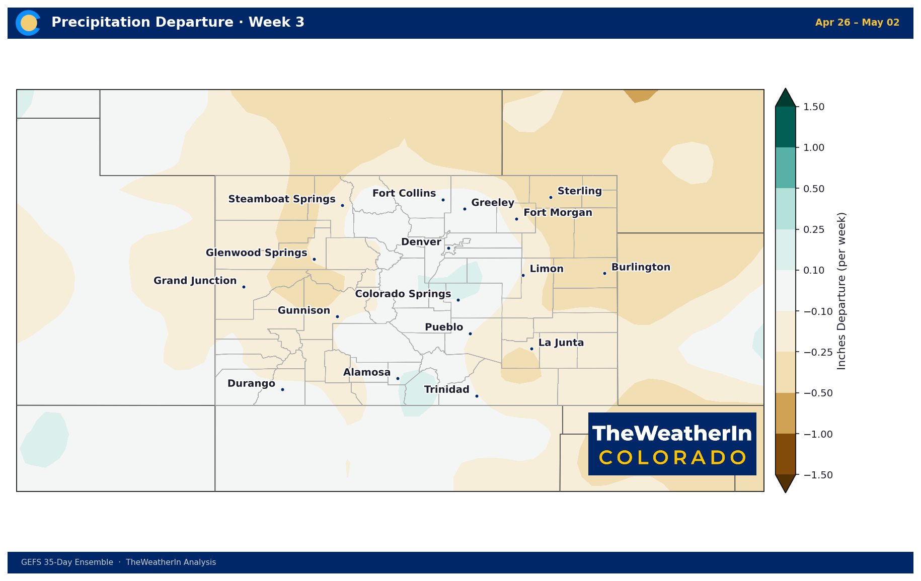 Week 1 is notably dry on the eastern plains — departures of -1.0 to -1.5 inches below normal near Burlington. Central Colorado is near-normal. The northwest corner (Steamboat/Routt County area) picks up modest moisture.