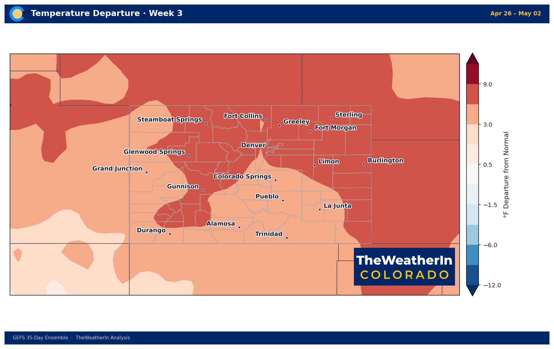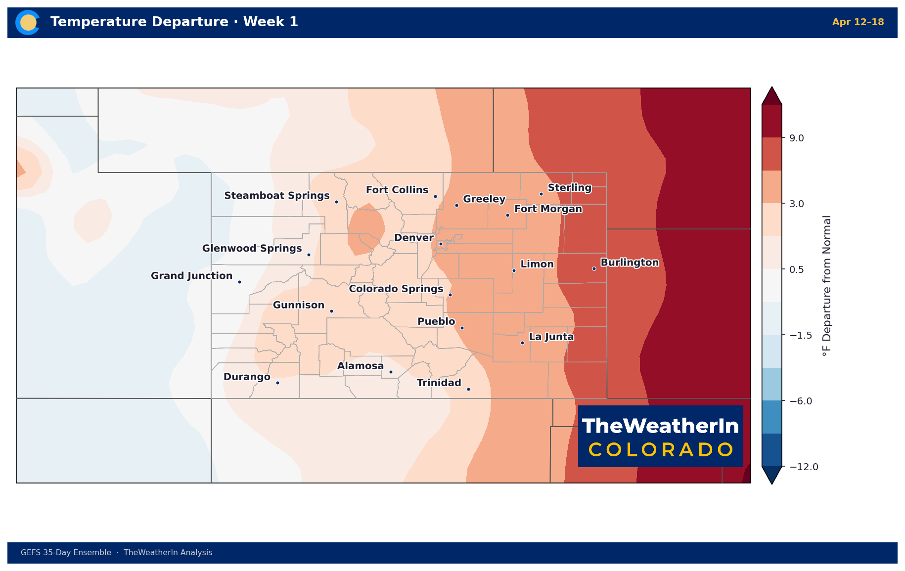 Week 1 features a pronounced warm anomaly across the eastern plains — departures of +6 to +9°F or greater near Burlington and the Kansas border. The Front Range runs +3 to +6°F above normal. The Western Slope is largely