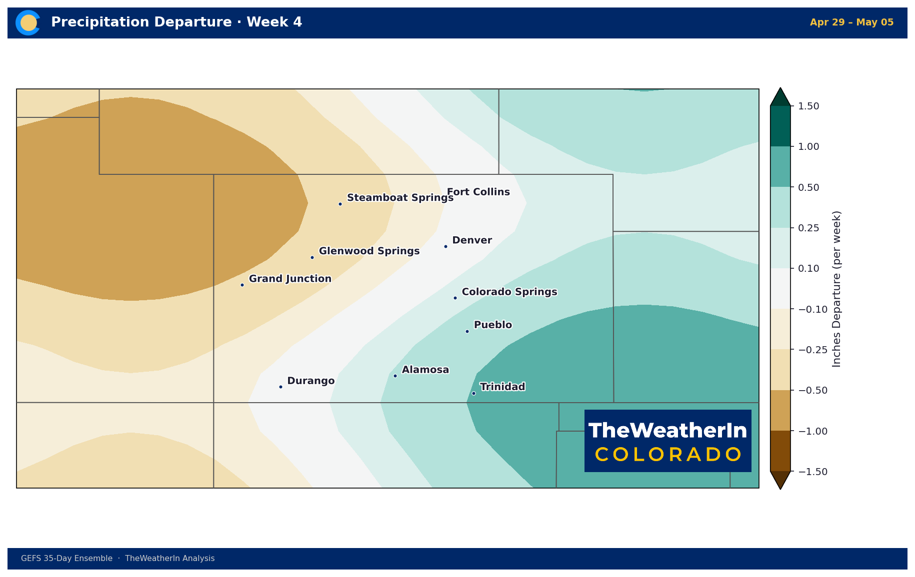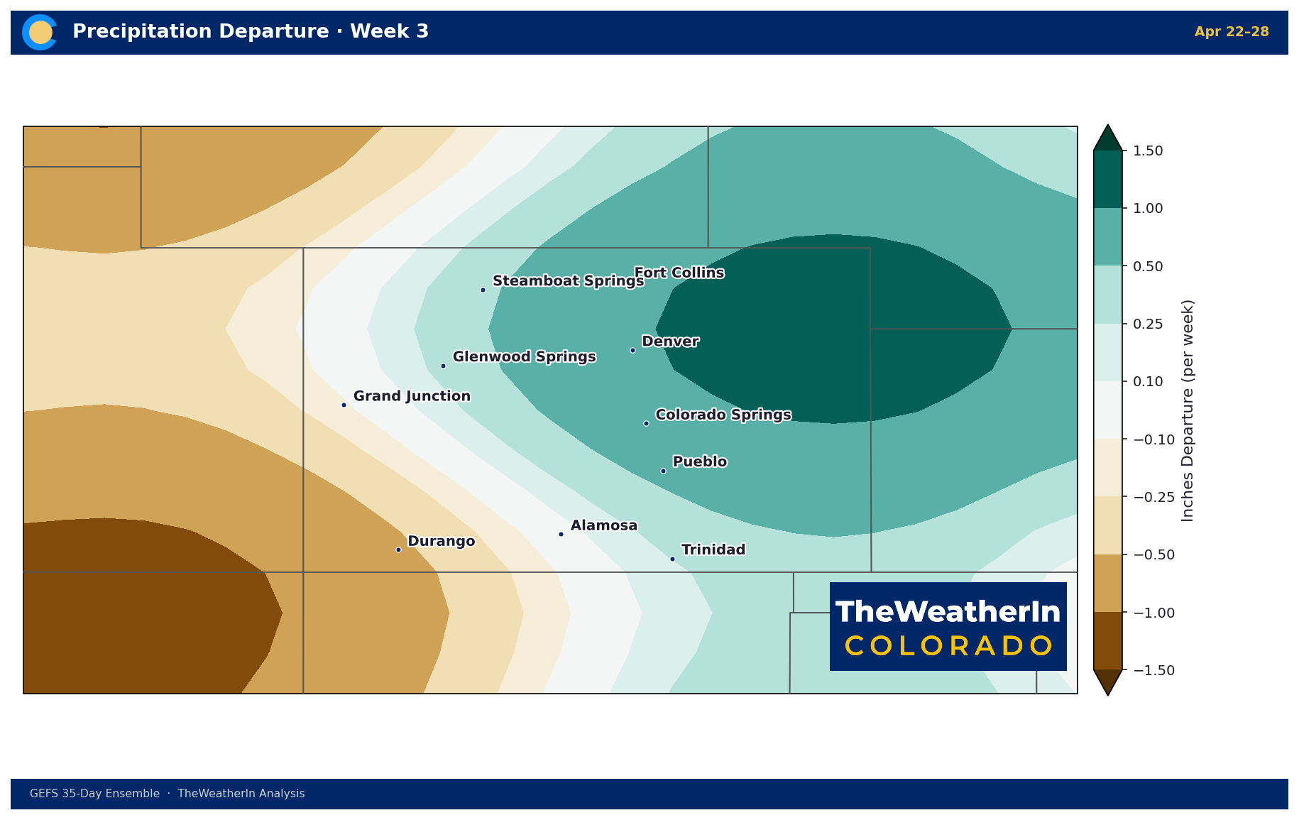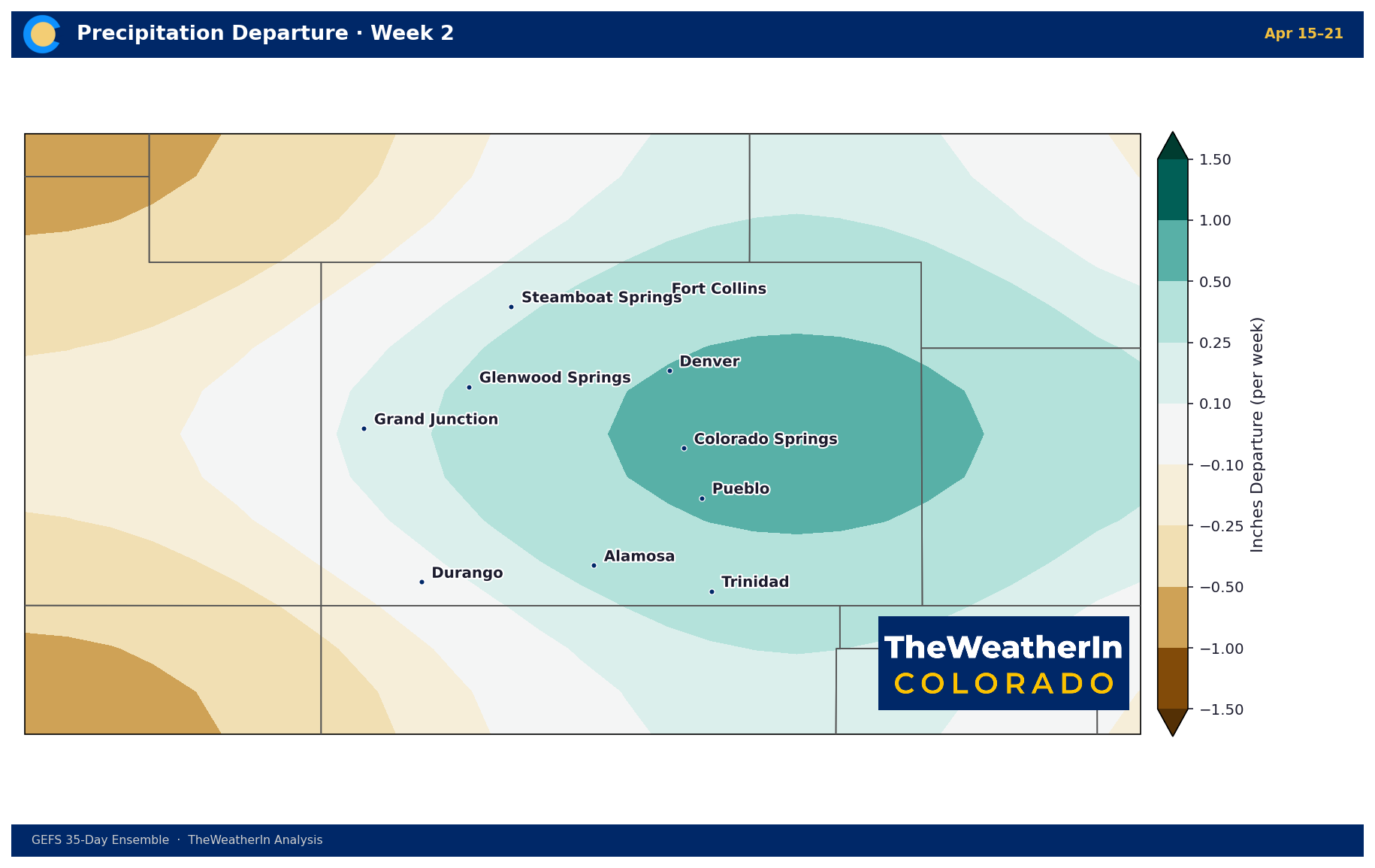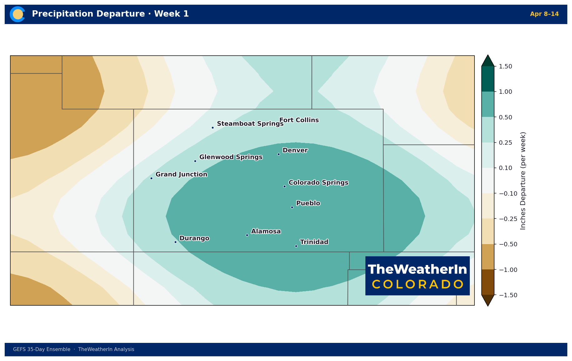 The wettest week of the period for the northern Front Range and northeast Colorado — departures of +0.5 to +1.0 inch above normal. Western Slope remains dry.