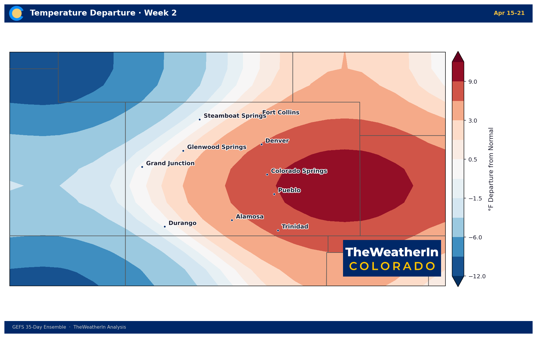 The warm signal intensifies in Week 2. The southern Front Range and SE Colorado are the core of the anomaly, with departures potentially exceeding +9°F near the Pueblo–Trinidad corridor. This is the strongest signal in the forecast window — confidence is moderate to high.