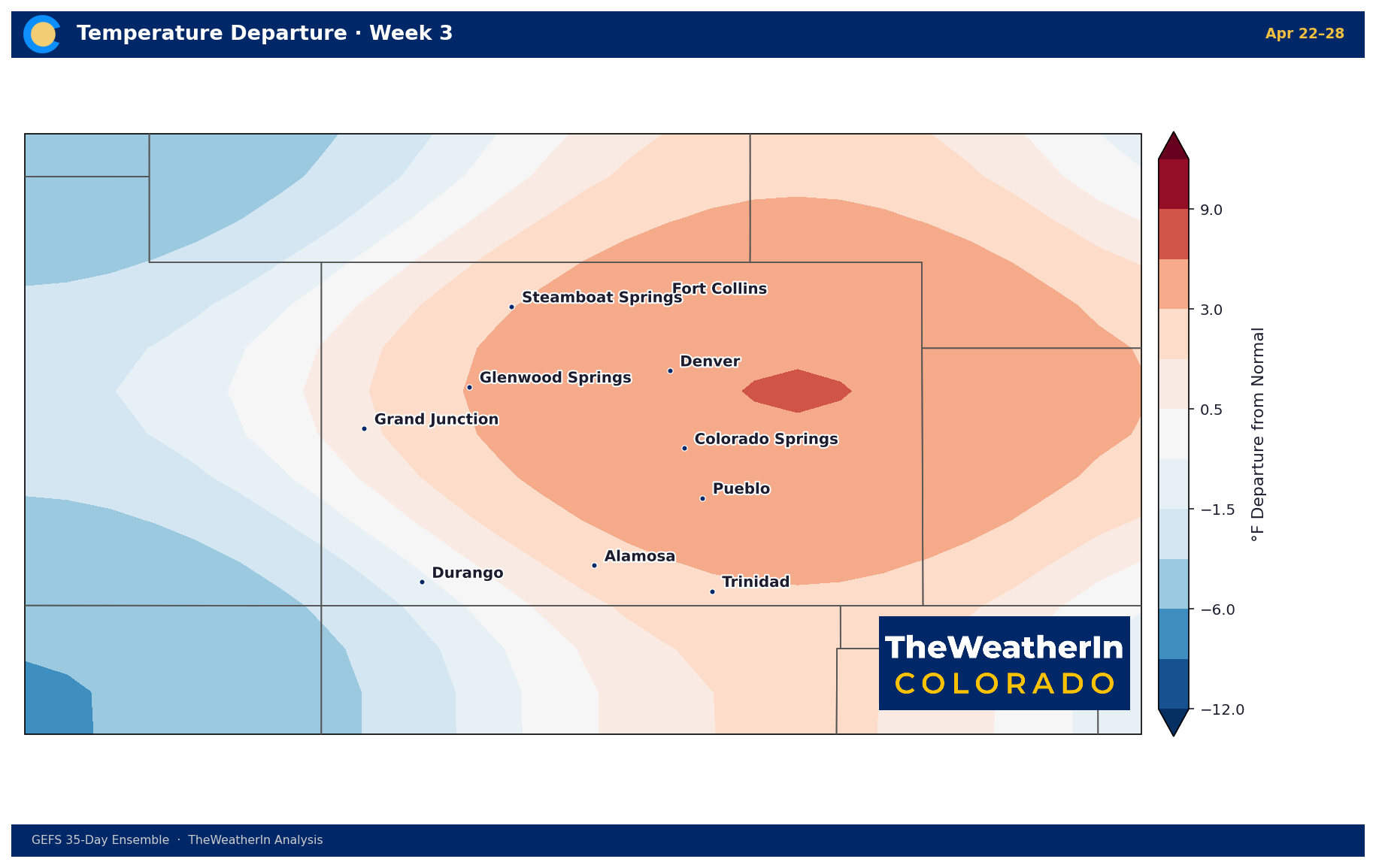 The anomaly relaxes but remains warm — +3 to +6°F on the Front Range. The western half of the state stays cooler than average.