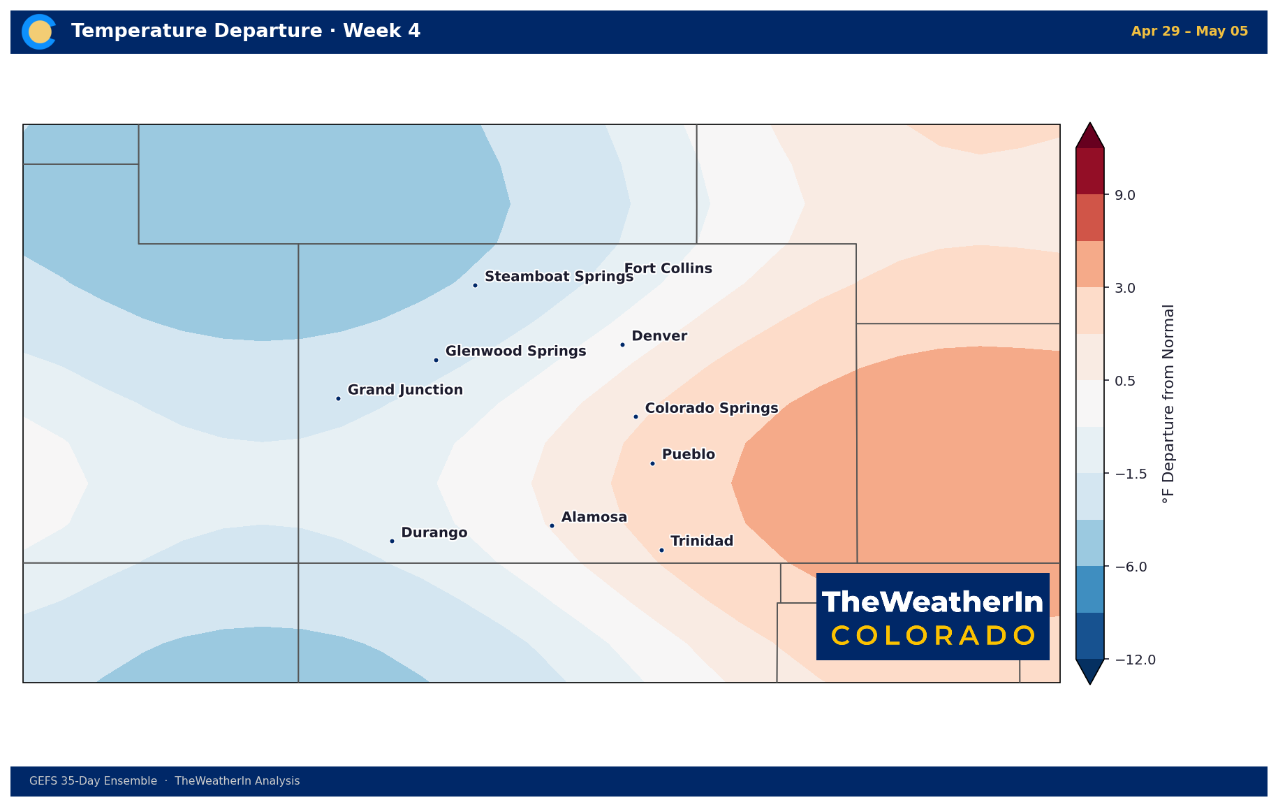 Week 1 kicks off warm, with departures of +3 to +6°F across the Front Range and +6 to +9°F near Pueblo and Trinidad. The Western Slope sits near normal to slightly below.