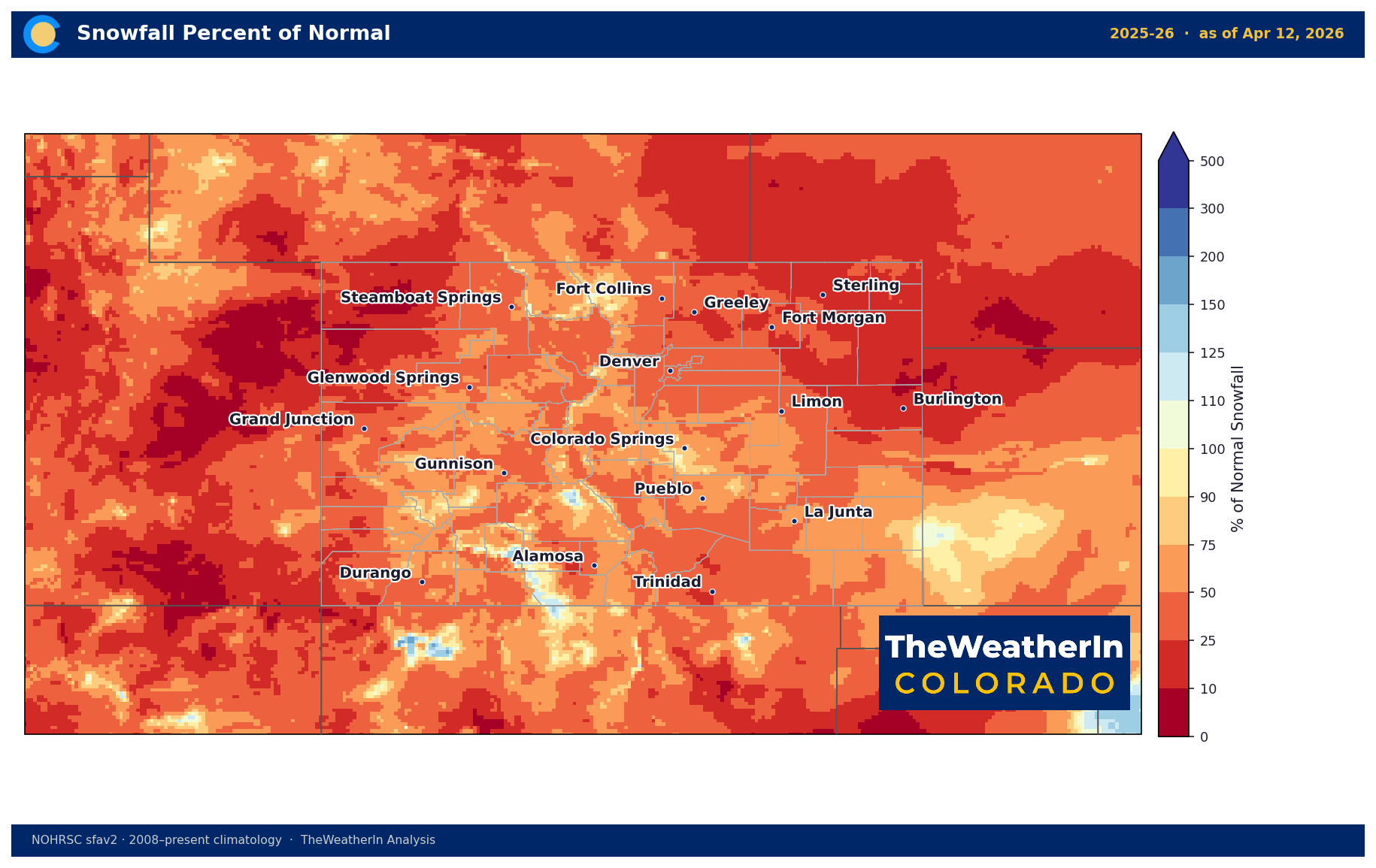The percent-of-normal map shows how widespread the deficit is. Nearly every mountain county in western Colorado sits in the orange-to-red range — 25 to 75% of normal.