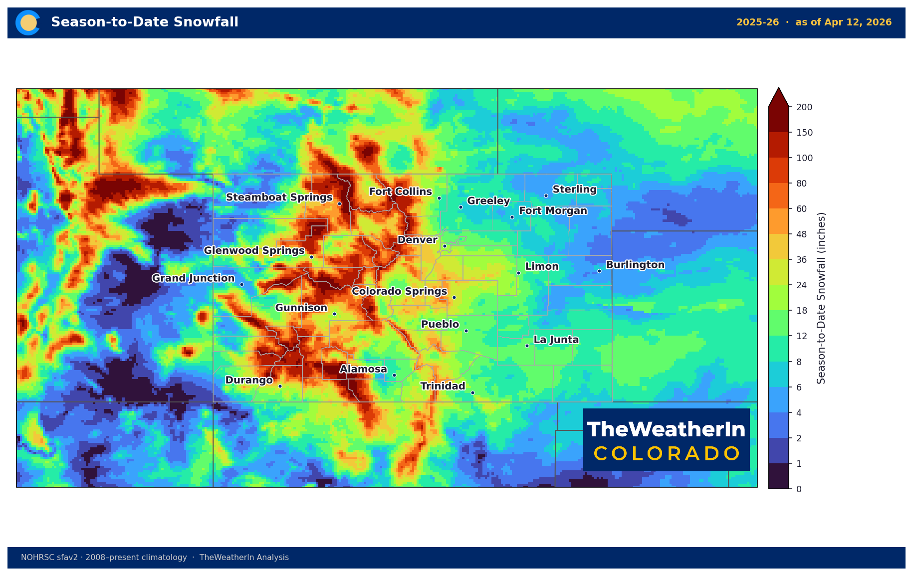 Data: NOHRSC National Snowfall Analysis, season-to-date through mid-April 2026.