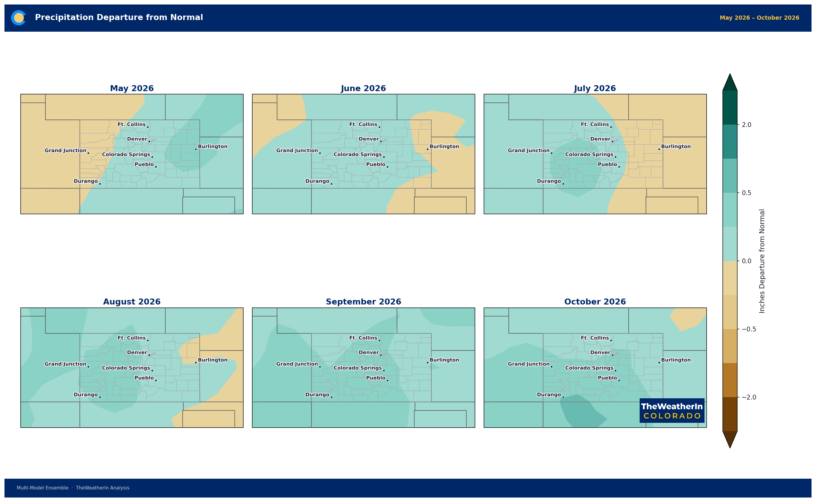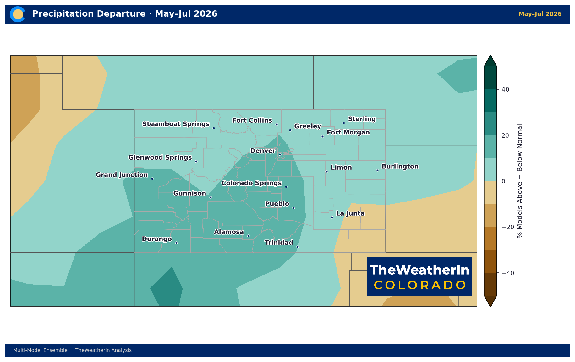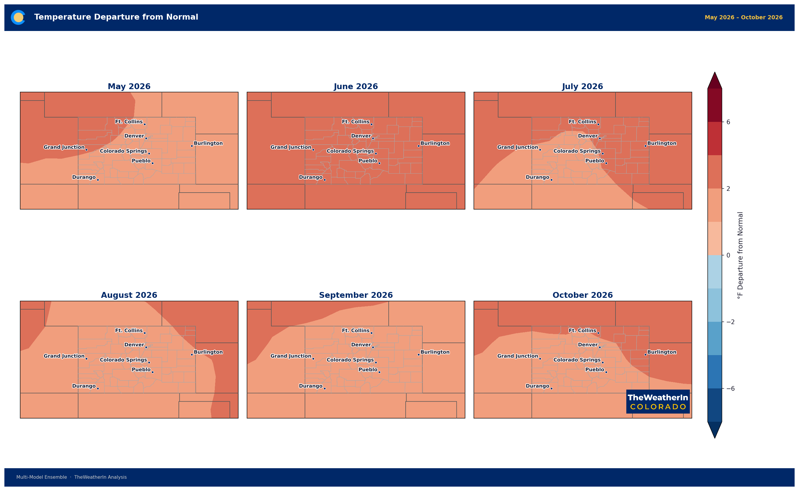 The temperature signal is remarkably consistent across the full outlook period. May and June show the strongest anomalies — departures of +4 to +6°F are favored across eastern and central Colorado, with the Front Range corridor
