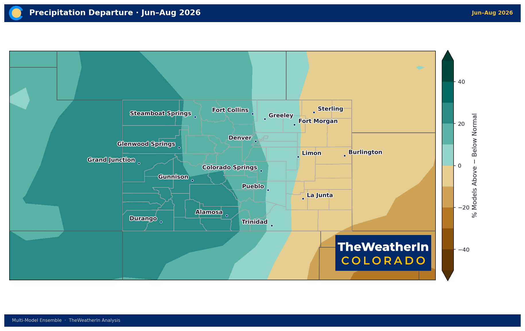The spring precipitation signal splits the state. The northwestern mountains and western slope show a wet lean — 20 to 40% more models favoring above-normal precipitation. The eastern plains trend drier, particularly the southeast corner. The Front Range sits in a near-neutral zone. For dryland agriculture on the plains, this is the most concerning part of the outlook.