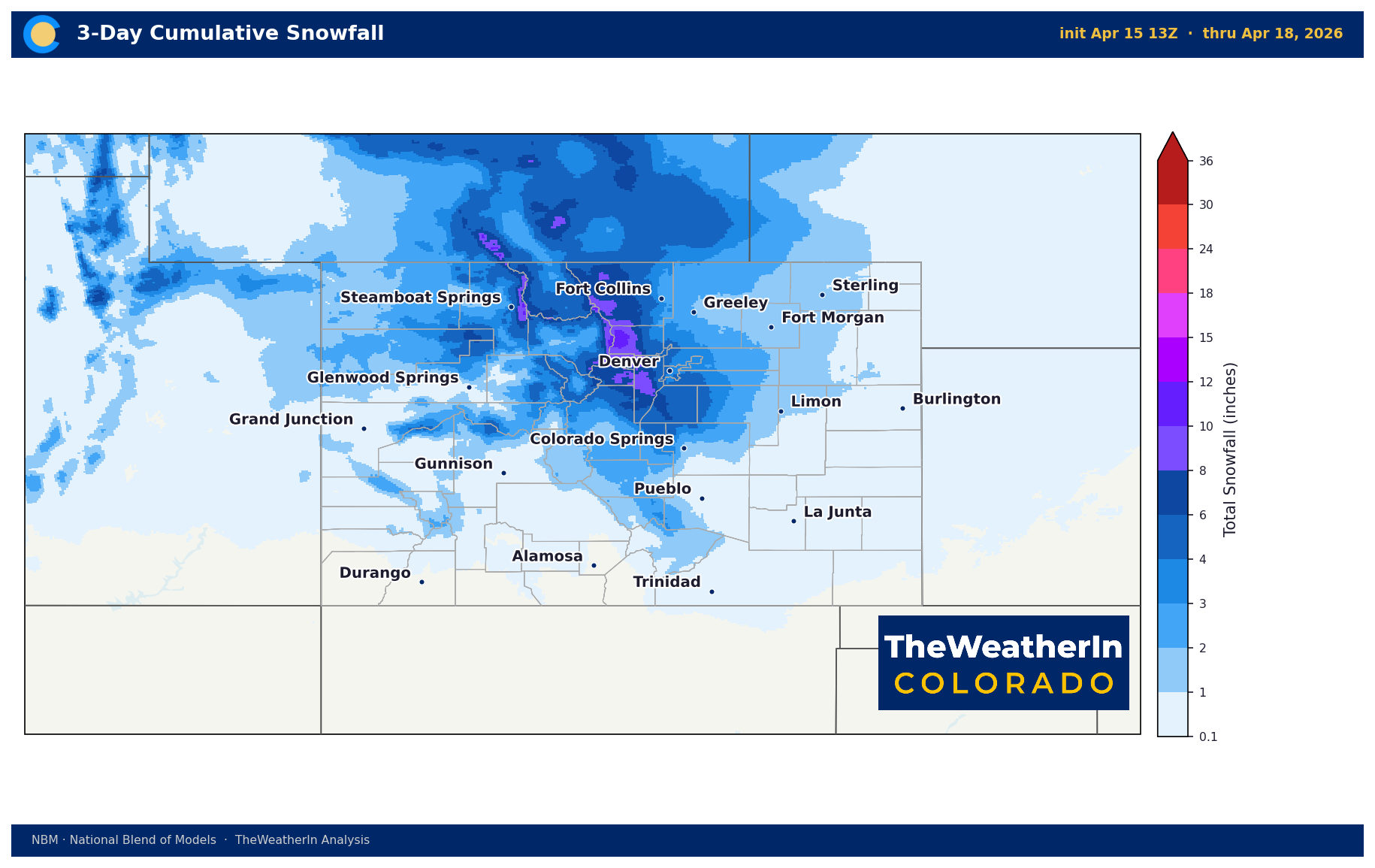 On the Western Slope, snow levels fall to 5,000 feet with widespread showers, and brief snow squalls are possible with the cold front Thursday night, leading to rapidly deteriorating road conditions.