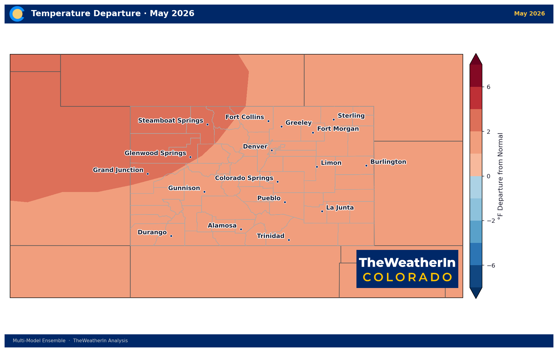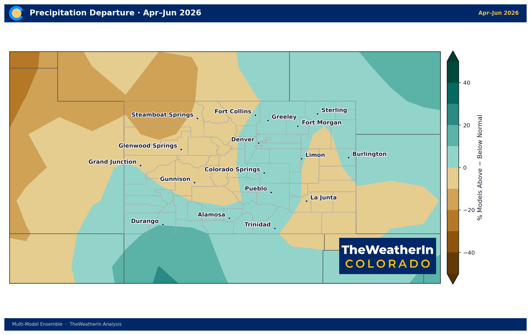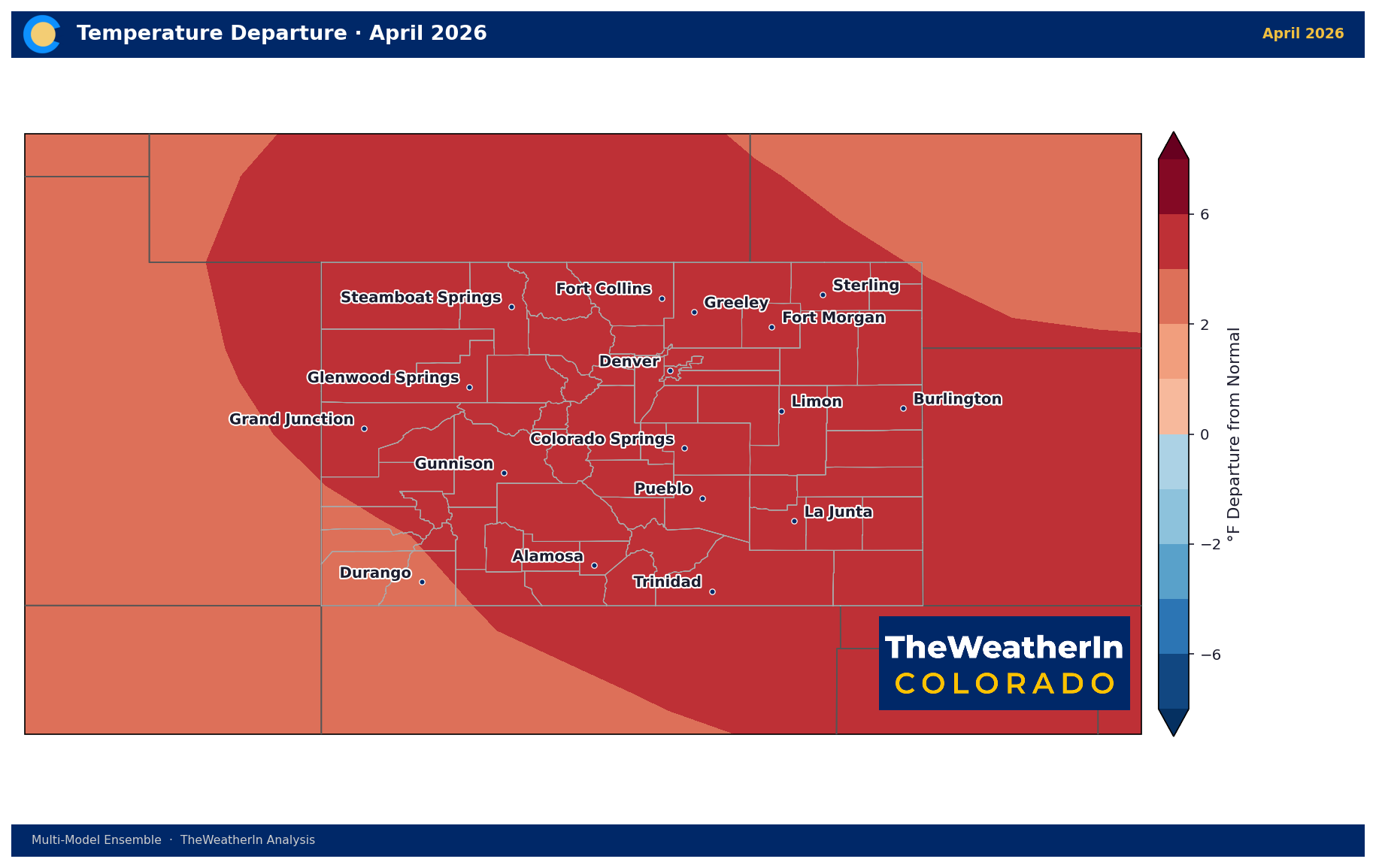 The dominant signal for spring 2026 is warmth — April is running 3 to 9°F above normal across the eastern plains and Front Range, and the seasonal outlook keeps that warmth in place through May and June.