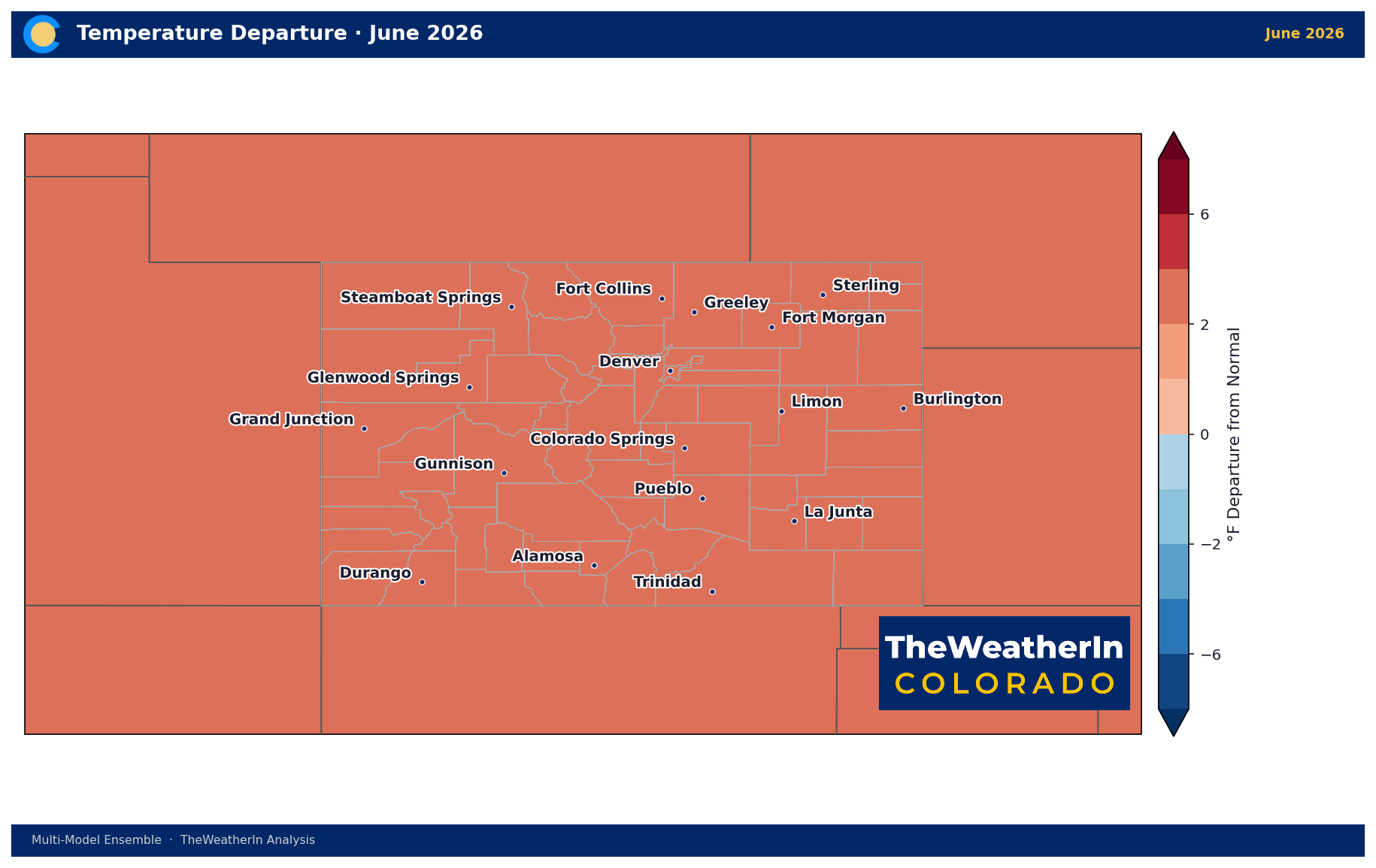 The June–August precipitation outlook leans wet for the mountains and western slope — a signal consistent with an active early monsoon. If this verifies, summer afternoon thunderstorm activity could be above normal, particularly across the San Juans, Elk Mountains, and Sawatch.